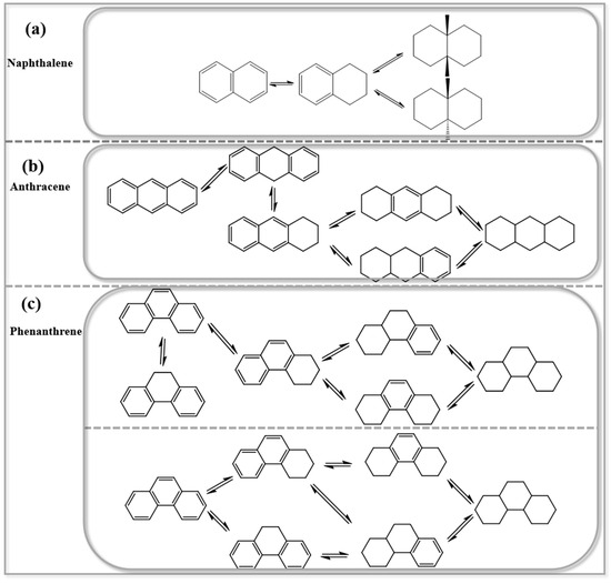 PAH hydrogenation reaction network: (a) naphthalene, (b) anthracene (c), phenanthrene.