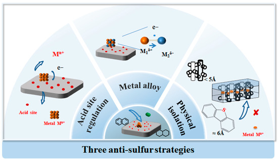 The alleviation of sulfur poisoning effects can be achieved by adjusting the physical and chemical environment of the catalyst surface. The mechanisms involved mainly include two approaches. The first is based on electronic structure modulation (such as the “electron-deficient” state theory) to change the chemical characteristics of the active sites [87]; the second is through physical isolation strategies to limit the contact between sulfur species and the active centers. The specific implementation paths include the following: (i) constructing sulfur-resistant alloy structures through electronic transfer effects, (ii) selecting carrier materials with suitable acidity and optimizing sulfur tolerance by adjusting the distribution of surface acidic sites, and (iii) utilizing the shape-selective effect of zeolite molecular sieves to effectively block the diffusion path of sulfides [88,89,90,91] (as shown in Figure 5).