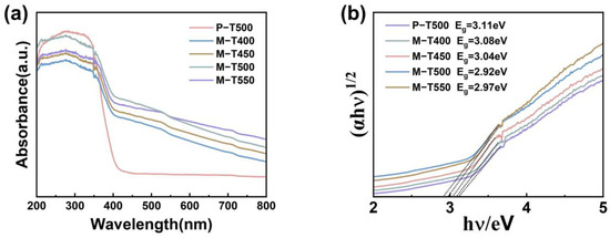 Figure 2a depicts the solid-state UV-visible absorption spectra of different catalysts, showcasing the characteristic absorption curves typical of indirect bandgap semiconductor TiO2 [21]. As is evident from the spectra, all four types of M-TiO2 exhibit higher light absorption thresholds and cover a broader range of absorption wavelengths. Utilizing the Kubelka-Munk formula, the bandgap energies of the five catalysts were calculated [27]. Among them, P-T500 has the largest bandgap, with values of 3.11 eV for P-T500 and 2.92 eV for M-T500, as shown in Figure 2b. These values indicate that M-T500 has a narrower bandgap, enabling it to respond to lower frequencies and a wider range of visible light wavelengths [28]. Consequently, compared to P-TiO2, M-TiO2 demonstrates superior light absorption capabilities and catalytic performance.