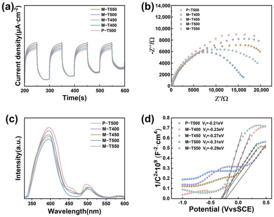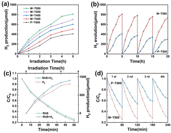 As shown in Figure 3d, the Mott-Schottky curves were analyzed for several catalysts to calculate their flat-band potentials. Among them, M-T500 exhibited the smallest flat-band potential, indicating that the electrons excited to the conduction band upon light irradiation possess a stronger reducing power [33]. These electrons are more likely to react with H+ in water to generate H2, thereby enhancing the photocatalytic hydrogen evolution activity.