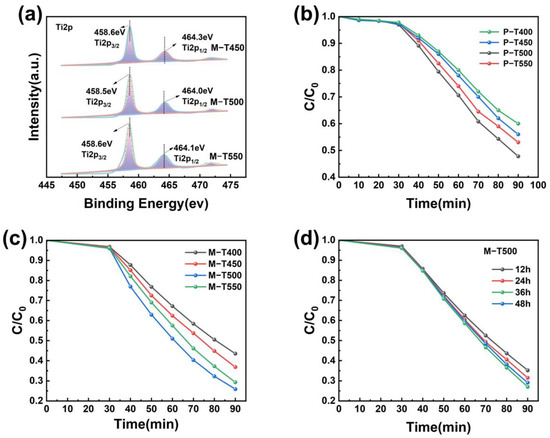 Through the X-ray photoelectron spectroscopy analysis of the samples, the bonding energies of the Ti2p orbitals were analyzed, and the bonding energies of Ti2p3/2 of Moiré-like TiO2 calcined at 450 °C, Moiré-like TiO2 calcined at 500 °C, and Moiré-like TiO2 calcined at 550 °C were 458.6 eV, 458.5 eV, and 458.6 eV. The binding energy is due to the Coulomb gravitational force between the electrons outside the atomic layer and the nucleus, and the change of the binding energy has a direct relationship with the electron density, and the decrease in the electron density will make the binding energy increase; on the contrary, the decrease in the binding energy is due to the gain of electrons [34,35]. The variation in the binding energy of elements on the catalyst surface indicates the transfer of photogenerated electrons [36,37]. As shown in Figure 4a, the binding energy of Ti2p in M-T500 is reduced compared to the other two samples, suggesting that electrons from other elements have been transferred to Ti2p in M-T500. The minimum binding energy of Ti2p at a calcination temperature of 500 °C typically implies that the structure and electronic distribution of the catalyst have reached an optimal state under this temperature condition [38,39]. Therefore, according to the decrease in binding energy of Ti2p, it can be seen that the density of photogenerated electrons of M-TiO2 is the largest at the calcination temperature of 500 °C, and then it can be seen that the catalytic effect of the catalyst is the best at the calcination temperature of 500 °C.