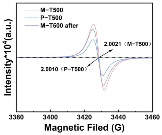In the detection of free radicals, the fluorescence intensity of 7-hydroxycoumarin and the UV absorbance of NBT were measured under light irradiation over a period of 1 h. As shown in Figure S3a, the fluorescence intensity of the emission spectrum gradually increased over time, indicating the continuous generation of hydroxyl radicals by M-T500 under illumination. As depicted in Figure S3b, the UV absorbance progressively decreased with time, suggesting that the sustained production of superoxide radicals reacted with NBT. EPR tests were conducted on P-T500 and M-T500 before and M-T500 after, as shown in Figure 6. The g-values of oxygen vacancies for P-T500 and M-T500 were 2.0021 and 2.0010, respectively. Meanwhile, the strength of M-T500 is higher than that of P-T500, indicating that M-T500 has a higher number of oxygen vacancies and thus forms more defects. A greater number of defects can enhance the separation efficiency of photogenerated electrons and holes, thereby improving the photocatalytic performance. As shown in Figure S4, the comparison of curves before and after the reaction also confirms the stability of M-TiO2, which is consistent with the conclusions drawn from the cyclic experiments.