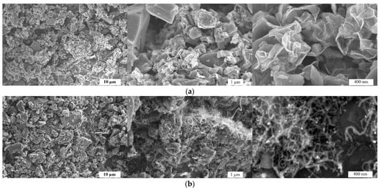 In this study, we propose a simple strategy for synthesizing an efficient non-noble metal-based carbon catalyst. The SEM images in Figure 1 illustrate the morphological differences between AWC-N (a) and AWC-Ni-N (b) catalysts at different magnifications. AWC-N (Figure 1a) had a highly porous structure with irregular, rough particles. At higher magnifications, micro- and mesopores were visible, along with sharp edges and a layered morphology, indicating effective chemical activation. In contrast, AWC-Ni-N (Figure 1b) exhibited more compact and interconnected particles. At higher magnifications (Figure 1b), wire-like or fibrous nanostructures were observed, likely due to the catalytic effect of nickel during the co-doping process. The wire-like or fibrous nanostructures observed in the AWC-Ni-N catalyst (Figure 1b, right panel) were absent in the AWC-N sample (Figure 1a), clearly indicating that their formation was linked to the incorporation of nickel during the synthesis process. Nickel has been widely reported to act as a catalyst for the growth of carbon nanofibers (CNFs) and carbon nanotubes (CNTs) under thermal conditions [39,40]. During the co-doping process, nickel likely facilitated the decomposition of carbon-containing precursors and promoted the precipitation of carbon into one-dimensional (1D) forms through a catalytic mechanism. Although no external carbon source was introduced, it is likely that carbonaceous species derived from the precursor material (e.g., biomass-derived alder wood char) underwent partial decomposition under thermal treatment in the presence of Ni, resulting in the formation of web-like fibrous carbon structures. Nitrogen co-doping may have further influenced the morphology by stabilizing these 1D structures. Such nanostructures improved the catalytic performance of AWC-Ni-N in subsequent electrochemical measurements.