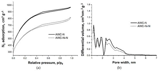 The porous-structure parameters (Table 1) indicate differences in the textural properties of AWC-N and AWC-Ni-N catalysts. AWC-N had a slightly higher specific surface area (BET: 2217 m2 g−1) compared with AWC-Ni-N (2050 m2 g−1), as well as a larger pore volume (1.6 cm3 g−1 vs. 1.3 cm3 g−1). A decrease in the specific surface area of AWC-Ni-N may have been related to an increase in the density of the material, as it was enriched with heavier Ni moieties, and to a possible partial blocking of the micropores by the Ni particles [7].
