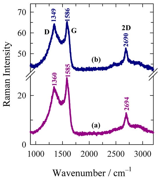 Figure 3 compares the 532 nm-excited Raman spectra of AWC-N and AWC-Ni-N catalysts. Both samples showed two strong bands visible at 1349–1360 cm−1 and 1585–1586 cm−1, corresponding to prominent D and G modes of graphite, respectively. In addition, a well-defined feature at 2690–2694 cm−1 was visible in the both samples. This feature belonged to the prominent 2D band and indicated an increase in the structural ordering of this carbon-based sample [43]. The important structural parameter in sp2-hybridized layered carbon material was the average in-plane crystallite size La [44,45].
