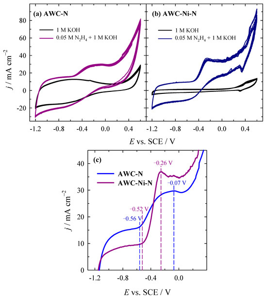 The electrocatalytic activity of the AWC-N and AWC-Ni-N catalysts was evaluated toward the HzOR in alkaline media. The activity of the prepared AWC-N and AWC-Ni-N catalysts was evaluated by cyclic voltammetry by recording CVs in 1 M KOH solution containing different concentrations of N2H4 in the potential range of −1.2 V to 0.2 V (vs. SCE) at an electrode-potential scan rate of 50 mV s−1 (Figure 6a,b). Figure 6c shows the stabilized (5th) LSVs for both catalysts in the same solution.