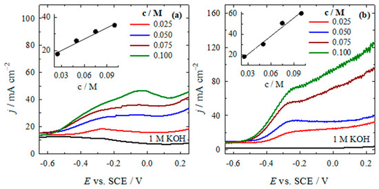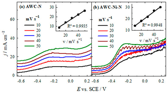 In addition, the dependence of the HzOR on the N2H4 concentration and on the scan rate was determined for both catalysts. Figure 7 shows the LSVs recorded on both catalysts in 1 M KOH solution containing different amounts of N2H4. As the concentration of N2H4 increased in the 1 M KOH solution (0.025–0.10 M), the measured current density also increased. This increase was observed in both the AWC-N and AWC-Ni-N catalysts (see Figure 7a,b).
