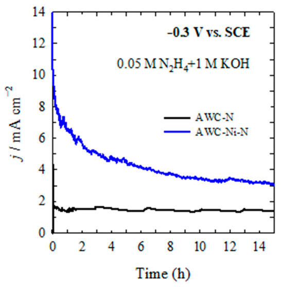 CA of AWC-N (black line) and AWC-Ni-N (blue line) catalysts recorded in 0.05 M N2H4 + 1 M KOH at −0.3 V vs. SCE, T = 25 °C.