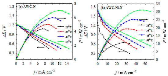 Polarization curves were run in triplicate, and no significant loss of activity was observed. The overlapping curves between repetitions show that the AWC-N and AWC-Ni-N electrocatalysts had excellent stability. The key fuel-cell performance parameters determined from these tests are summarized in Table 4. The fuel cell displayed an open circuit voltage of approximately 1.25 V and 1.7 V using AWC-N and AWC-Ni-N as the anode and cathode catalysts, respectively. It was observed that the power density achieved with the AWC-Ni-N catalyst was significantly higher than that obtained with the AWC-N catalyst (Figure 10, Table 4). Peak power densities of up to 10.8 mW cm−2 were achieved at 25 °C, corresponding to a current density of 27 mA cm−2 and a cell voltage of 0.4 V (Figure 10), when the AWC-Ni-N catalyst was used as both anode and cathode. In addition, the peak power-density values increased by approximately 1.6 times and 2.9 times for the AWC-N and AWC-Ni-N catalysts, respectively, when the operating temperature was increased from 25 °C to 55 °C.