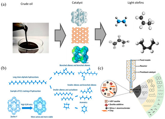 - Tanimu, A.; Tanimu, G.; Alasiri, H.; Aitani, A. Catalytic cracking of crude oil: Mini review of catalyst formulations for enhanced selectivity to light olefins. Energy Fuels 2022, 36, 5152–5166. [Google Scholar] [CrossRef]