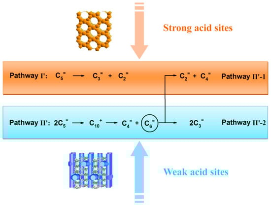 - Lin, L.F.; Zhao, S.F.; Zhang, D.W.; Fan, H.; Liu, Y.M.; He, M.Y. Acid strength controlled reaction pathways for the catalytic cracking of 1-Pentene to propene over ZSM-5. ACS Catal. 2015, 5, 4048–4059. [Google Scholar] [CrossRef]