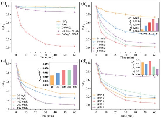 The effect of PAA concentration in the range of 0.1–5 mM on aniline degradation is shown in Figure 1b. As shown in the figure, aniline degradation increased with higher PAA concentrations; however, the rate of increase slowed. Increasing PAA concentration from 0.1 mM to 2 mM significantly enhanced aniline removal, rising from 26.9% to 98.1%. However, when PAA concentration increased to 5 mM, the aniline removal rate dropped to 89.6%. Increasing PAA concentration in the system enhances the utilization of active sites on CoFe2O4, generating more ROS. However, high PAA concentrations saturated the CoFe2O4 surface, reducing ROS generation and limiting the aniline degradation rate. Furthermore, an excess of PAA would undergo reaction with ROS within the system, thereby competing with the pollutants and resulting in a reduction in available ROS for pollutant degradation [28].