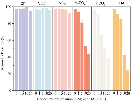 The presence of H2PO4− significantly inhibited the degradation of aniline. The decrease in the removal rate was associated with two distinct mechanisms: firstly, the free radical scavenging and the production of phosphate radicals [37], and secondly, the formation of precipitates in neutral environments when H2PO4− was complexed with CoFe2O4 [37,38]. These precipitates exhibited low activity when reacting with PAA, thereby inhibiting the degradation of aniline.