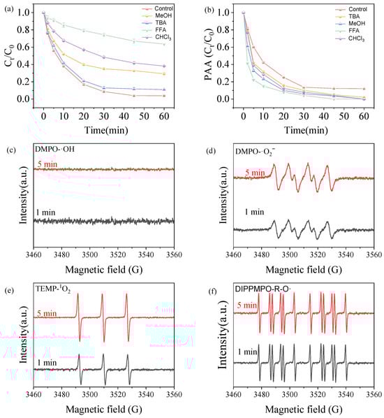The formation of reactive oxygen species (OH·, R-O·, 1O2, and O2−·) in the CoFe2O4/PAA system was further verified by EPR experiments [45,46]. DMPO served as the spin trap for detecting OH· and O2−·, while DIPPMPO and TEMP were used for R-O· and 1O2, respectively. As shown in Figure 3d–f, DIPPMPO-R-O·, TEMP-1O2 (1:1:1), and DMPO- O2−· adducts were detected in the CoFe2O4/PAA system. No DMPO-OH· signal was observed (Figure 3c), and EPR signal intensity at 5 min was stronger than at 2 min, indicating that R-O· and 1O2 were produced.