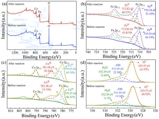 The Co 2p XPS spectra before and after reaction (Figure 4c) revealed characteristic peaks at 779.57 eV (Co 2p3/2) and 795.1 eV (Co 2p1/2) for Co(III), and 781.08 eV (Co 2p3/2) and 796.8 eV (Co 2p1/2) for Co(II). Post-reaction analysis showed a decrease in Co(III) content from 49.74% to 46.21% with a corresponding increase in Co(II) from 50.26% to 53.79%, confirming the ≡Co(II)/≡Co(III) redox cycle [24]. Notably, while the ≡Fe(III)/≡Fe(II) cycle contributed minimally to PAA activation compared to the cobalt cycle, iron presence facilitated Co(III)→Co(II) conversion (Equations (6)) [47], enhancing the catalyst electron transfer capacity. The O 1s spectra (Figure 4d) displayed three components: lattice oxygen (529.57 eV), surface hydroxyl oxygen (531.05 eV), and adsorbed oxygen (532.49 eV). Reaction-induced changes included lattice oxygen decrease (68.92%→64.59%), with increases in surface hydroxyl (19.58%→22.58%) and adsorbed oxygen (11.5%→12.83%). These shifts reflect Co(III) reduction and surface hydroxyl group formation (Co-OH/Fe-OH, Equations (7)–(9)) [25,47].