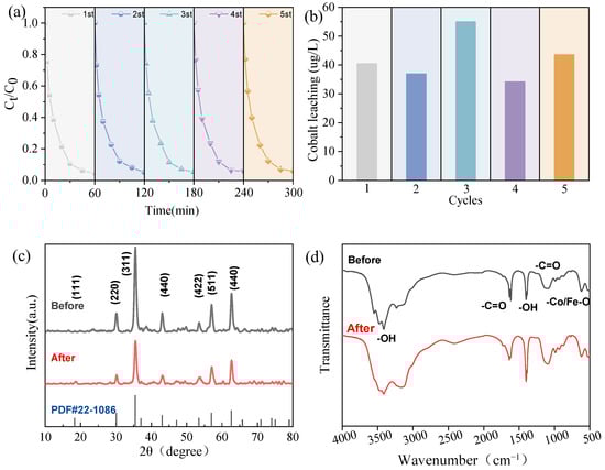 The stability of the catalytic performance of CoFe2O4 was evaluated through the implementation of cyclic experiments, and the subsequent catalytic degradation experiments carried out the alkaline desorption of the reacted CoFe2O4. Figure 5a illustrates that the CoFe2O4/PAA system demonstrated consistent degradation of aniline, with the removal rate of aniline by CoFe2O4/PAA remaining above 95% after five consecutive cycles. Additionally, the highest cobalt ion leaching was around 0.0547 mg/L over five cycles (Figure 5b), while no iron ions were detected. The cobalt concentration is significantly below the reference standard limit of 1.0 mg/L set by the Environmental Quality Standard for Surface Water. The aforementioned results demonstrate that CoFe2O4 is a highly recoverable and stable PAA activator.