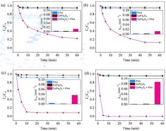 Given the complex composition of biochemical tail water containing diverse organic matter, and in order to more effectively evaluate the ability of CoFe2O4 to activate PAA, four organic pollutants, ATZ, SMX, phenol, and acid red 14, were degraded under identical reaction conditions ([PAA] = 1 mM, [CoFe2O4] = 100 mg/L, [pollutant] = 100 μM, pH = 7.0, T = 25◦ C, reaction time = 60 min) (as pesticides, antibiotics, phenolic pollutants, and dyes). As shown in Figure 6a–d, the degradation efficiencies of ATZ, SMX, phenol, and acid red 14 were 77.48% (kobs = 0.0129 min−1), 87.02% (kobs = 0.0122 min−1), 91.74% (kobs = 0.0364 min−1), and 99.99% (kobs = 0.0874 min−1). Experimental evidence confirmed that ROS-mediated degradation dominated the removal of all four pollutants, with adsorption and direct PAA oxidation playing negligible roles. These findings demonstrate that CoFe2O4 effectively activates PAA, making it a highly efficient peroxyacid oxidant for organic pollutant degradation.