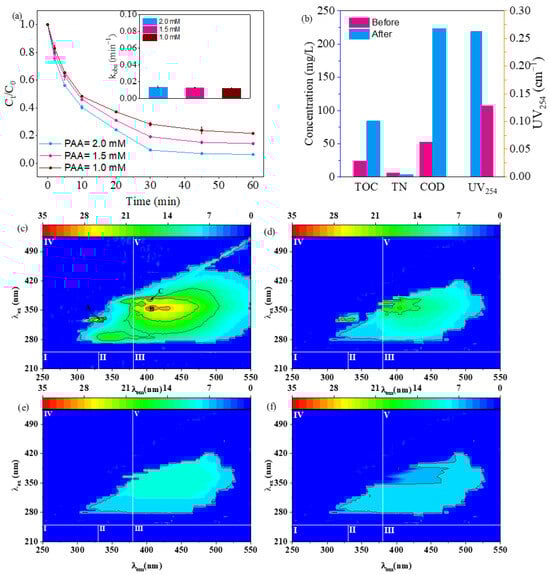 The degradation of aniline in biochemical tailwater; (a) water quality parameters (TOC, TN, BOD, COD, and UV254) of biochemical tailwater before and after degradation; (b) 3D-EEM results of biochemical tailwater before degradation, (c) 5 min, (d) 20 min, (e) 60 min (f) into the reaction. Experimental conditions: [Aniline] = 100 µM, [PAA] = 1 mM, [CoFe2O4] = 0.10 g/L, pH = 7.0, T = 25 °C.