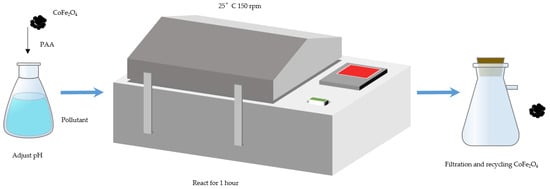 All degradation experiments were conducted in 250 mL glass beakers containing 100 mL of contaminant solution at 25 °C, maintained using a water bath. The reactions were performed with constant stirring (150 rpm) using an SYC-2A shaker (Shanghai Bonding Instrument, Shanghai, China). After adding CoFe2O4 and adjusting the pH (0.5 M H2SO4/NaOH), PAA was introduced to initiate the reaction (Figure 8). Aliquots (1.5 mL) were collected at predetermined time intervals (0–60 min), immediately filtered through 0.22 μm PTFE membranes, and quenched with 0.10 mM Na2S2O3 prior to HPLC analysis.