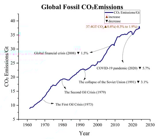 The global population is growing exponentially, while modern industries are also developing rapidly. As a result, the reliance on fossil fuel combustion is quite high. With the annual average consumption of fossil fuels continuously rising, this has led to consistently high levels of greenhouse gas emissions, such as CO2 and methane (see Figure 1) [1,2]. According to data from the Global Carbon Project (GCP), since the 1960s, global fossil fuel CO2 emissions have steadily increased, with projections suggesting that by 2024, emissions will reach 37.4 billion tons (see Figure 2) [3,4]. Although emissions have experienced significant fluctuations during certain historical phases, such as the oil crisis of the 1970s, the global economic downturn in the early 2000s, and the large-scale COVID-19 pandemic, this trend has remained persistent. The large-scale emission of greenhouse gases has contributed to the intensification of global warming, which has further triggered an increase in extreme weather events. It is worth mentioning that global warming has led to a series of negative impacts, including but not limited to glacier melt, droughts, floods, tsunamis, increased pests and diseases, declining soil quality, as well as changes in crop growth cycles and planting regions [4,5]. It is important to emphasize that although methane has 25 times the greenhouse effect of CO2 per kilogram, its overall emission in the atmosphere is relatively small due to its primary sources being livestock and landfills. Additionally, its presence in the atmosphere is relatively short, around 10–12 years, while CO2 can remain in the atmosphere for centuries. Therefore, CO2 is considered the leading cause of the greenhouse effect. According to the data released by the International Energy Agency (IEA), there has been a significant increase in the concentration of CO2 in the atmosphere. The concentration of CO2 has risen from approximately 280 parts per million (ppm) before the industrial revolution to over 420 ppm currently, which is a 52% increase compared to pre-industrial levels. In order to better address the various issues caused by CO2 emissions, there is an urgent need to develop efficient CO2 capture and catalytic conversion technologies.