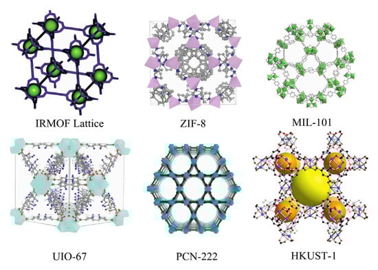 A popular series of MOFs, classified according to the ligand situation, encompasses approximately six categories, which are further divided into six series: IRMOFs structure series, ZIF structure series, MIL structure series, UIO structure series, HKUST series, and PCN structure series. The molecular structure diagrams of these materials are shown in Figure 3.