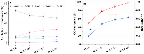 Catalytic activity of KCLZ-xP catalysts: (A) ROH distribution; (B) CO conversion, C2+OH/MeOH (derived from distribution of alcohols).