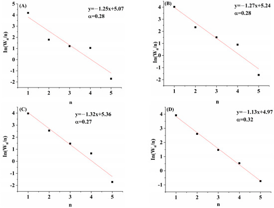 ASF plot of alcohols and the corresponding chain-growth probability (α): (A) KCLZ; (B) KCLZ-10P; (C) KCLZ-20P; (D) KCLZ-30P.