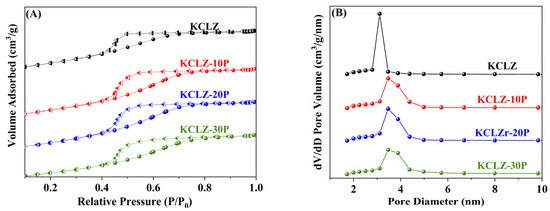 (A) N2 adsorption–desorption isotherms; (B) distributions of pore size over the KCLZ-xP catalysts.