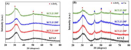Crystallinity and phase patterns were performed to investigate the effect of P123 on HAS. XRD patterns of calcined and reduced KCLZ-xP catalysts are shown in Figure 4A and Figure 4B, respectively. As displayed in Figure 4A, a relatively broad diffraction peak in the range of 28–38° for the calcined KCLZ-xP catalysts are unambiguously indexed to amorphous ZrO2 (am-ZrO2) [29,30]. Remarkably, it can be seen that the KCLZ-30P catalyst has distinct diffraction peaks around 30.3°, 50.3°, and 60.2°, which were attributed to tetragonal ZrO2 (t-ZrO2, JCPDS 50–1089) [17]. In other words, as the content of P123 increases, the presence of am-ZrO2 in the calcined KCLZ-xP catalyst is accompanied by the emergence of t-ZrO2, indicating that the introduction of P123 promotes the formation of t-ZrO2. No phases attributed to CuO and La2O3 were observed in the calcined KCLZ-xP catalysts, which may be due to the high dispersion of CuO and the low loading amount of La2O3.
