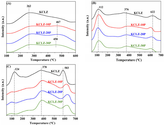 (A) CO, (B) CO2, and (C) NH3-TPD profiles of KCLZ-xP catalysts.