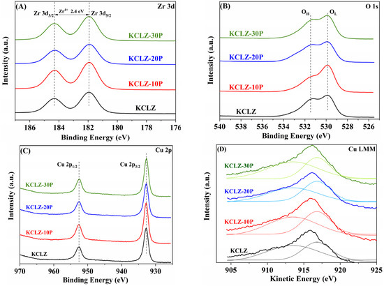 We used a surface sensitive technique XPS to obtain surface information about the composition, chemical state, and electronic structure on the reduced catalyst. The XPS patterns of Zr 3d, O 1s, Cu 2p, and Cu LMM regions of the catalysts were shown in Figure 7. As presented in Figure 7A, the Zr 3d3/2 and Zr 3d5/2 of KCLZ-xP catalysts locate at approximately 184.2 and 181.8 eV, respectively, with a disparity of 2.4 eV, which are in good accordance with the reported data of Zr4+ [38,39,40]. At the same time (Figure 7B), the oxygen species with binding energy at 531.3 eV was attributed to the hydroxyl species (OH), and the oxygen species at a lower binding energy of 529.9 eV was attributed to the lattice oxygen species (OL) [41]. The surface OH can react with CO to generate C1 species (CHxO), which is also an important intermediate in the process of alcohol formation [17]. And then, as shown in Figure 7C, the Cu 2p spectra presented two prominent peaks at around 954.7 and 934.5 eV, which corresponded to Cu 2p1/2 and Cu 2p3/2, respectively. Moreover, the lack of satellite peaks within the binding energy range of 940–945 eV indicated that all Cu2+ species had been reduced to Cu+ or Cu0 at 360 °C. To gain further insights, the Cu LMM XAES spectra were obtained (Figure 7D). It was observed that the broad and asymmetrical peak centered at around 916.8 eV and 913.5 eV, which was assigned to Cu0 and Cu+ species, respectively [42]. The proportions of Cu+ species (XCu+) obtained after peak deconvolution are summarized in Table 2. Combined with the XRD results, Cu0 and Cu+ species coexisted on the surface of reduced KCLZ-xP catalysts.