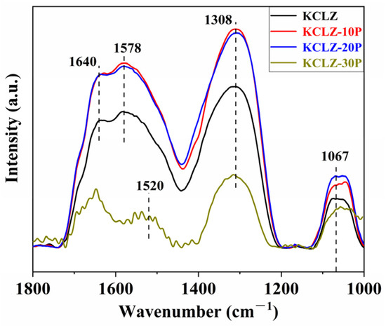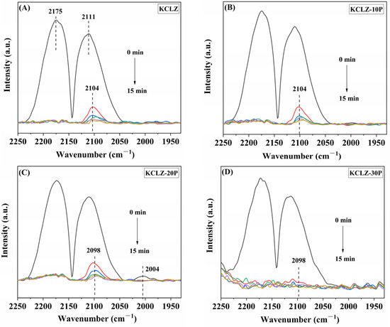The aim for a better understanding of the surface chemistry on the KCLZ-xP catalysts with different P123 contents, in situ CO-DRIFT spectroscopy was exploited. Figure 8 and Figure 9 show the in situ CO-DRIFT spectra in the high-frequency range of 2175–2025 cm−1 and the low-frequency range of 1850–1150 cm−1, respectively. Compared with Cu0 and Cu2+ species, CO-Cu+ has stronger interaction and thermal stability [43]. Therefore, the stable peak approximately at 2104 cm−1 for the KCLZ-xP catalysts is likely to be related to the existence of Cu+-CO carbonyls, which act as the predominant species [39,44], while the bands at 2004 cm−1 are considered to be due to the CO adsorbed on Cu0 [45]. In the case of KCLZ catalyst, the peak at 1640 cm−1 is ascribed to the bridged bicarbonate species (b-HCO3−), which serves as evidence that CO had reacted with the surface OH groups, leading to the formation of C1 species [17,39]. Another peak appearing at 1578 cm−1 could be possibly linked to the O-C-O asymmetric stretching vibration of bidentate formate species (b-HCOO−) [30,46,47]. Additionally, the peak at 1308 cm−1 has been identified as corresponding to the result of the overlap of formate (b-HCOO-Cu, 1350 cm−1) and bridged bidentate carbonates (b-HCO3−, 1250 cm−1) [30,39], whereas the absorption peak at 1067 cm−1 is ascribed to C-O stretching vibrations of methoxyl species [48]. Upon increasing the P123 content to 20 g, the intensity of the absorption peaks linked to HCO3− and HCOO− increased significantly. However, for the KCLZ-30P catalyst, the intensity of the absorption peaks associated with HCO3− and HCOO− decreased significantly, especially for the HCOO− species. At the same time, a new absorption peak appeared at about 1520 cm−1 of the KCLZ-30P catalyst, which was the characteristic peak of monodentate carbonate species (m-CO32−) [39]. According to the above results, we found that increasing P123 caused the characteristic peak of all species on the catalyst surface increased first and then decreased, which may be related to the change in the specific surface area of the catalyst (SBET result).
