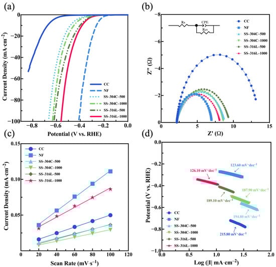 Through electrochemical testing, the comprehensive electrochemical performance of the three substrate materials was analyzed. As shown in Figure 2a, within the scanning range, NF is the most efficient with the lowest overpotential value of 264.10 mV (vs. RHE), while CC is the least efficient with the highest overpotential value of 675.10 mV (vs. RHE). This was followed by SS of different models and mesh sizes between NF and CC, among which the 1000-mesh 316L stainless steel mesh showed the lowest hydrogen evolution overpotential at 385.00 mV (vs. RHE). The electrochemical impedance spectroscopy (EIS) data (Figure 2b) were modeled using an equivalent circuit comprising solution resistance (Rs), connected in series to a parallel arrangement of charge transfer resistance (Rct) and the constant phase element (CPE) [40]. As illustrated in Figure 2b, NF exhibited the smallest Rct value (4.84 Ω), indicative of its superior conductivity. Among various SS configurations, the 1000-mesh 316L SS demonstrated the lowest Rct (6.02 Ω), highlighting its enhanced charge transfer efficiency compared to other SS variants. CC had the largest Rct at 11.42 Ω. The results of the EIS and LSV tests for CC, NF, and SS generally followed the same trend: NF performed the best, CC performed the worst, and SS fell between the two. However, the trend varied slightly among different specifications of SS.