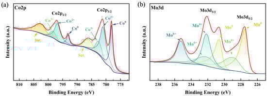 Subsequently, XPS (as shown in Figure S4) was used to characterize the detailed electronic states of the constituent elements in the prepared Co-Mo alloy composite stainless steel mesh cathode catalyst material. As shown in Figure 4, the XPS spectra were calibrated using the C1s peak at 284.80 eV as a reference. The Co2p and Mo3d spectra of CoMo/SS were fitted to identify the optimal spin–orbit peaks and satellite peaks. In Figure 4a, the Co2p spectrum exhibits a strong main peak at 778.10 eV corresponding to Co2p3/2, and the fitted peak for Co2p1/2 has a binding energy of 793.13 eV, indicating the presence of metallic cobalt [41]. The fitted peaks for Co2+2p3/2 and Co2+2p1/2 have binding energies of 780.96 eV and 796.75 eV, respectively. The fitted peaks for Co3+2p3/2 and Co3+2p1/2 have binding energies of 782.53 eV and 798.32 eV, respectively. In Figure 4b, the fitted peak for Mo3d5/2 has a binding energy of 227.50 eV, corresponding to metallic molybdenum in the cobalt–molybdenum alloy. The fitted peaks with binding energies of 228.91 eV and 232.05 eV correspond to Mo3d5/2 and Mo3d3/2, respectively, and are attributed to Mo in the +4 oxidation state [42]. The fitted peaks for Mo6+3d5/2 and Mo6+3d3/2 have binding energies of 232.14 eV and 235.23 eV, respectively. The presence of metallic cobalt and molybdenum indicates that the cobalt and molybdenum ions in the electrolyte were successfully reduced to their zero-valent metallic states, demonstrating the effectiveness and feasibility of the electroplating method employed.