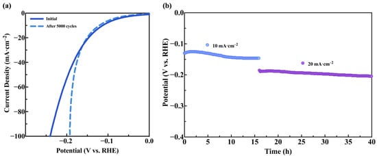 Additionally, Figure 6a shows the LSV curves of the Co-Mo alloy before and after 5000 cycles of cyclic voltammetry, and Figure 6b presents the stable long-term chronopotentiometric measurement at constant current densities of 10 and 20 mA·cm−2 for a total of 40 h. It can be observed that the overpotential at 10 mA·cm−2 changed by only 8.40 mV after 5000 cycles, demonstrating that CoMo/SS exhibits excellent stability for hydrogen evolution during long-term operation [44,45,46,47].