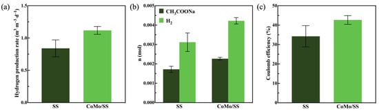By calculating the coulombic efficiency of the MEC system, the energy efficiency of the system was further analyzed. As shown in Figure 7c, the coulombic efficiency for hydrogen production in the MEC system with blank SS as the cathode was 34.26%, while in the MEC system with CoMo/SS as the cathode, the coulombic efficiency reached 42.68%, representing an increase of 8.42%. This improvement, close to half of the total coulombic efficiency, demonstrates that CoMo/SS plays a significant role in reducing energy loss during the hydrogen production process in MECs.