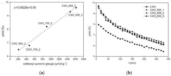 More recently, we revisited the ODH of isobutane, but instead of activated carbons, carbon xerogels were used as catalysts [], taking advantage of their mesoporous nature and negligible ash content. We used the same methodology as before [], in order to prepare a set of catalysts with different amounts of active sites but with similar physical properties. First, we prepared a strongly oxidized carbon xerogel (CXO); other samples were obtained from CXO by thermal treatment under an inert atmosphere at distinct temperatures. This set of catalysts was then used in the ODH of isobutane, and their activity was correlated with the active site concentration (determined by TPD), as shown in Figure 3a. The TOF was obtained from the slope of this linear correlation: TOF = 3.17 × 10−4 s−1 at 375 °C. Turnover frequencies had not been previously reported for the ODH of lower alkanes with carbon catalysts. In addition, we could demonstrate the negative effect of carboxylic groups, as shown in Figure 3b, where we compare the performance of the original oxidized catalyst (CXO) with samples treated at 600 °C. At this temperature, the concentration of the active sites is not affected, but all carboxylic groups are removed from the surface. The presence of these electrophilic groups decreases the electron density at the active sites, therefore lowering their activity. Thus, CXO is less active than the thermally treated samples, in spite of having the same concentration of active sites. Catalyst deactivation by coke formation was found to be responsible for the yield decrease with time-on-stream observed in Figure 3b [].