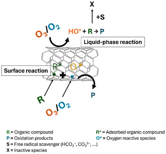 The reaction mechanisms are complex and may involve a combination of homogeneous and heterogeneous steps. Indeed, similar results were observed upon the addition of a free-radical scavenger to the liquid phase; thus, oxidation of the organic pollutant can be promoted by active oxygen species on the surface of the carbon catalyst, in addition to the process that occurs in the liquid phase promoted by free-radicals, as schematically shown in Figure 4 [].