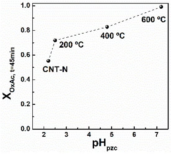 Nevertheless, it has been shown that the catalytic activity of carbon materials in AOPs increases with the concentration of basic sites, as shown in Figure 5 for the case of wet air oxidation []. Here, the conversion of oxalic acid was studied on a series of carbon nanotube catalysts obtained from a nitric acid oxidized sample (CNT-N), subsequently heat-treated at increasing temperatures (200, 400, 600 °C), in order to selectively remove the oxygenated surface groups, thereby increasing their pHPZC. Similar correlations were reported for wet peroxide oxidation [] and ozonation [].
