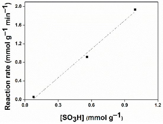 Biomass-derived carbons functionalized with sulfonic acid groups were used as catalysts for glycerol transesterification with ethyl acetate to produce acetins. A linear correlation between the initial rate of glycerol conversion and the concentration of the sulfonic acid groups was established, as shown in Figure 7a. The calculated TOF at 77 °C was 1.55 × 10−3 s−1 []. Nevertheless, this process was found to be less effective than the esterification of glycerol with acetic acid using the same catalysts [].