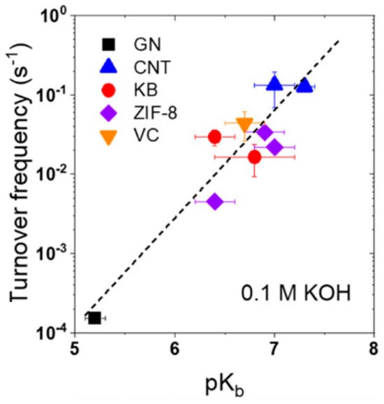Turnover frequency versus pKb of metal-free carbon materials investigated as catalysts for the ORR in 0.1 M KOH (KB—Ketjenblack; VC—Vulcan carbon; CNT—carbon nanotubes; GN—graphene; ZIF-8—zeolitic imidazolate framework-8). Reprinted with permission from [] Copyright 2025 American Chemical Society.