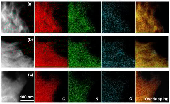 EDS mapping of the C, N, and O elements on (a) glu-dcda, (b) fru-dcda, and (c) gal-dcda.