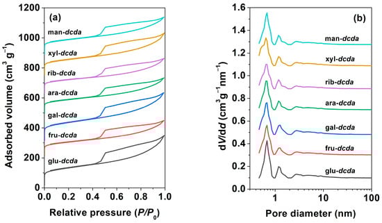 The surface chemical properties of the ms-dcda materials were investigated by X-ray photoelectron spectroscopy (XPS). The C 1s spectra in Figure 6a can be fitted into four peaks at binding energies (BE) of ca. 284.5, 285.4, 286.4, and 287.3 eV, assignable to graphitic C, C−N, C−O, and C=O, respectively [34]. As displayed in Figure 6b, the O 1s spectra were fitted into two peaks at 531.8 eV from C=O and at 533.3 eV from C–O [28]. Table 2 summarizes the total O content and the fraction of each O species on the surface of the ms-dcda materials. The surface O contents were in the range of 2.99 to 4.93 at %. Moreover, the relative content of the C=O and C–O species was greatly influenced by the type of monosaccharide, which awaits further investigation and elucidation.