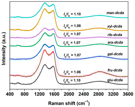 Raman characterization is commonly used to determine the structure of carbon materials. As shown in Figure 5, there are bands at 1350 and 1580 cm−1 for the ms-dcda materials. The former is associated with the non-sp2 carbon defects at the edge or on the basal plane of graphene and termed as the D band, whereas the latter is related to the sp2 carbon of graphene and termed as the G band [44,45]. The intensity ratio of the two bands (ID/IG) reflects the degree of disorder, which fell in the range of 1.06–1.10 for the ms-dcda materials.
