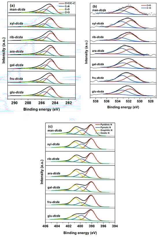 (a) C 1s, (b) N 1s, and (c) O 1s spectra of the ms-dcda materials.
