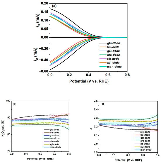 The H2O2 selectivity and electron transfer number (n) were calculated from the iR and iD measured on the RRDE. As presented in Figure 7b,c, all the ms-dcda catalysts maintained impressively stable H2O2 selectivity and electron transfer number in the range of 0.40–0 V. Among the ms-dcda catalysts, glu-dcda also afforded the highest H2O2 selectivity, which varied in a narrow range of 89.0–91.6% and maximized at 0.40 V. In contrast, ara-dcda afforded the lowest H2O2 selectivity varying in the range of 82.9–86.3%.