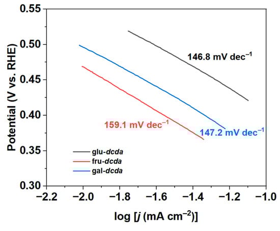 Tafel slopes of glu-dcda, fru-dcda, and gal-dcda in the O2-saturated 0.1 M HClO4 electrolyte with a scan rate of 10 mV s−1 and a rotation speed of 1600 rpm.