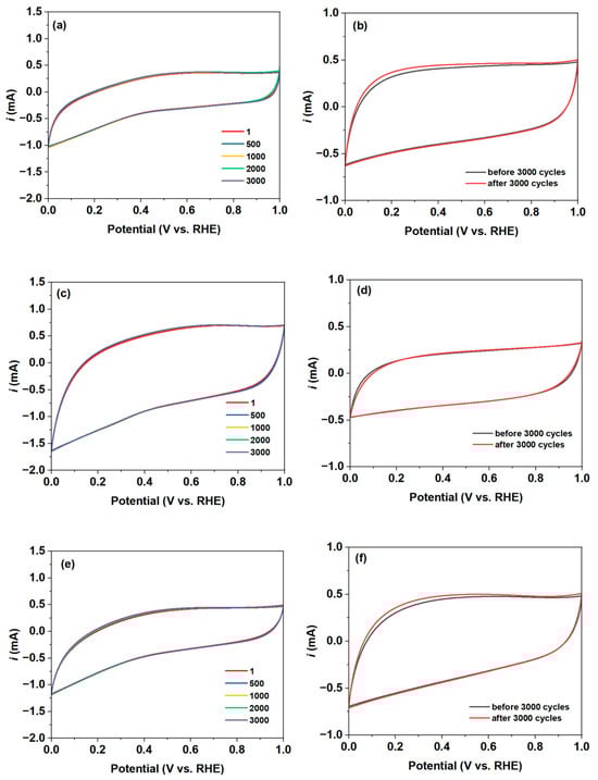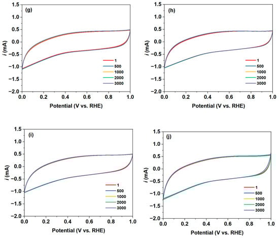 As the primary product on the ms-dcda catalysts, H2O2 is a highly reactive oxidizing agent, so the stability is of priority for the catalyst used in 2e-ORR [29]. Hence, accelerated durability testing (ADT) [47,48] was adopted to evaluate the cyclic stability of the ms-dcda catalysts, which involved electrochemically cycling the catalyst at a rapid scan rate of 200 mV s−1 between 1.0 and 0 V for 3000 cycles. Figure 9a,c,e,g–j show that the CV curves of the ms-dcda catalysts after 3000 cycles were similar to those of the first cycles. It should be mentioned that the ms-dcda catalysts are more stable than the N and B co-doped carbon (BN-C1) [47] and mesoporous carbon (MesoC) catalysts [48], manifesting their excellent electrochemical stability in 2e-ORR in acidic electrolyte. To clarify whether or not the material itself had been changed after ADT, we collected the capacitance curves in the absence of O2 by saturating the electrolyte with N2 for glu-dcda, fru-dcda, and gal-dcda after 3000 cycles of ADT. It turns out that the capacitance curves are virtually identical before and after ADT (Figure 9b,d,f), further evidencing the robustness of the ms-dcda catalysts.