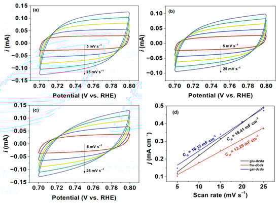 Cyclic voltammograms in the non-Faradic potential region at varying scan rates of 5, 10, 15, 20, and 25 mV s−1 in the N2-saturated 0.1 M HClO4 electrolyte for the (a) glu-dcda, (b) fru-dcda, and (c) gal-dcda catalysts. (d) The corresponding plots of average current density vs. scan rate.