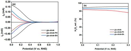 For the ms-dcda catalysts, XPS characterization revealed the presence of the C–O and C=O species (Figure 6). Therefore, according to previous reports [29,31,49,50], benzoic anhydride and phenylhydrazine were used to block the C–OH and C=O groups, respectively. Treatment of glu-dcda with benzoic anhydride and phenylhydrazine resulted in catalysts designated as glu-dcda-BA and glu-dcda-PH, respectively. The electrocatalytic tests on the site-blocked catalysts revealed a considerable decrease in activity as compared to the pristine catalysts, while the extent is dependent on the blocked functional group (Figure 12a). The glu-dcda-PH catalyst showed the more pronounced decrease in catalytic performance, with the H2O2 partial current at 0 V decreasing from 0.169 mA to 0.084 mA and reduction in H2O2 partial current of 50.3% as compared to 33.1% for glu-dcda-BA. Furthermore, its onset potential (0.374 V) is also more negative than that of glu-dcda-BA (0.418 V). These selective site-blocking results verify that both the C–OH and C=O groups are capable of catalyzing H2O2 electrosynthesis, with the C=O group being more active than the C–OH group, which is consistent with the findings of Liu and co-workers [31] and Joo and co-worker [29]. Moreover, the H2O2 selectivity over glu-dcda-PH is also lower than that over glu-dcda-BA (Figure 12b), indicating that the C=O group is also more selective than the C–OH group in 2e-ORR. Liu and co-workers pointed out, by DFT calculations, that the C=O group delivers the ΔGOOH* of 4.24 eV, which approaches the volcano vertex of the Sabatier curve [31].